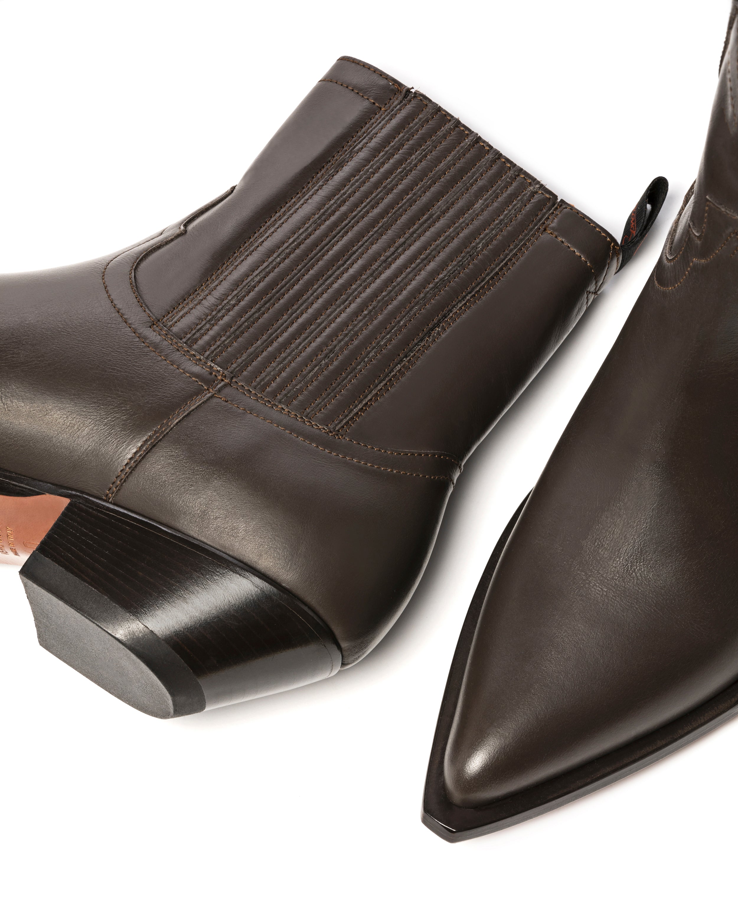 Chelsea boots with covered elastic which in natural calf leather. They have a cool, western-inspired silhouette with a pointy toe and a slanted heel. The customised gros-grain loops ensure that they're easy to pull on and off.