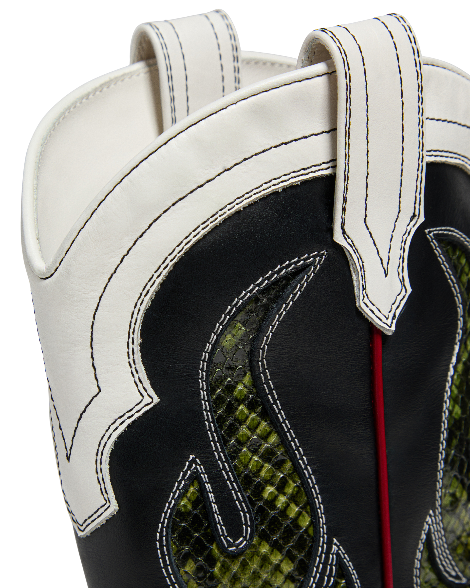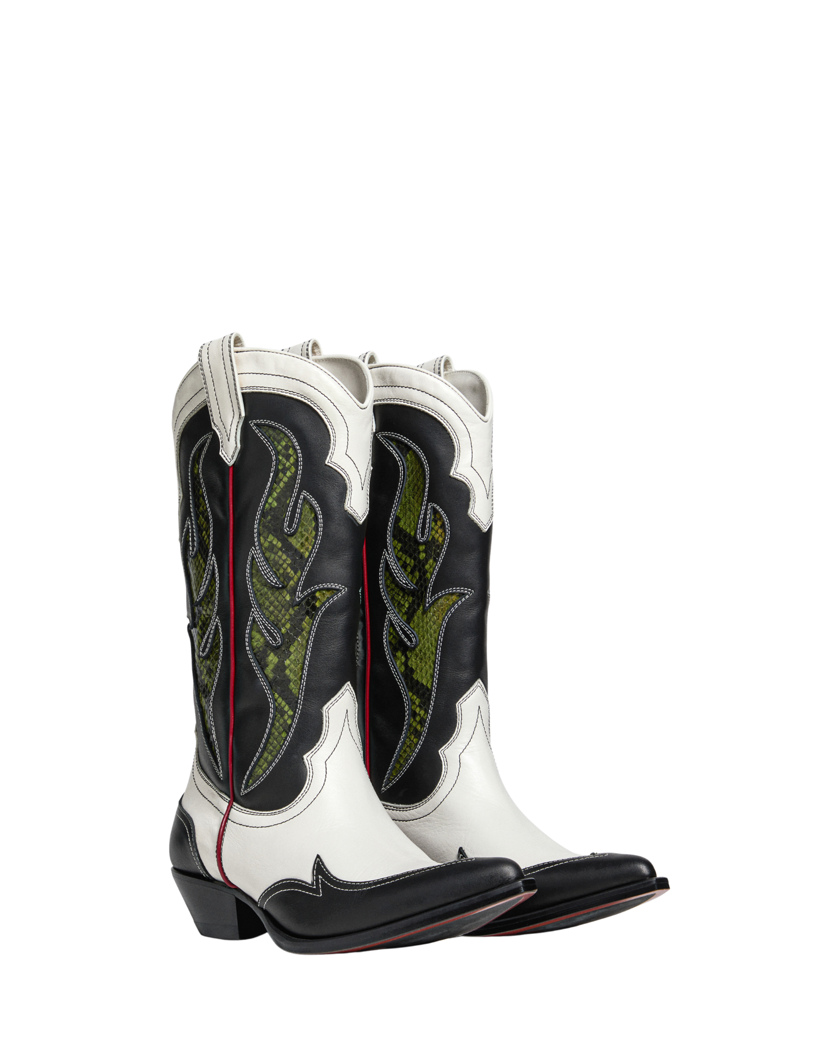 Crafted from black and white calf leather, enhanced by striking green Ayers inserts. The mix of classic tones with a pop of color creates a standout Western-inspired look with a modern twist.
