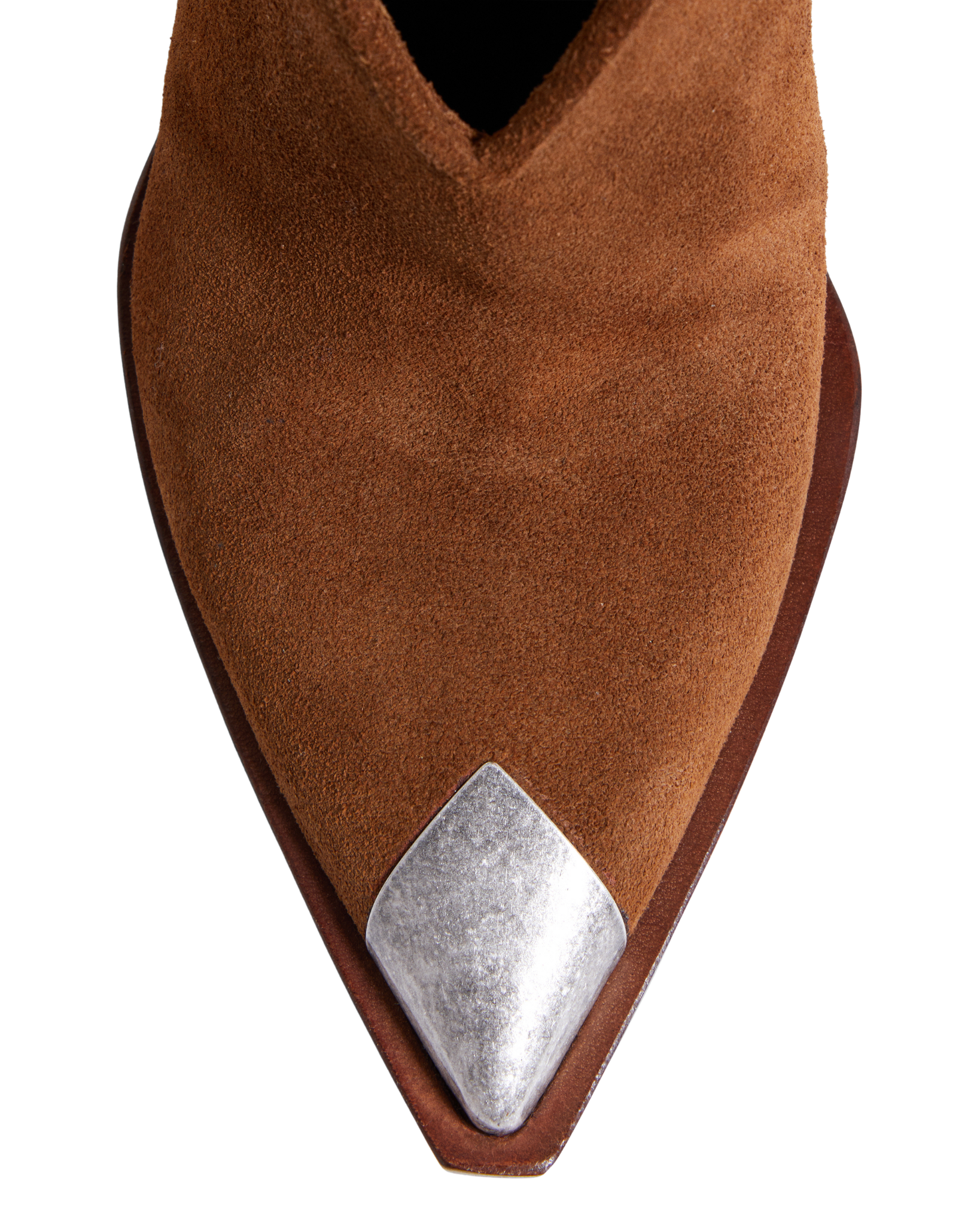 A bold interpretation of an evergreen silhouette – the Santiago by Sonora are crafted from Ruaty Brown suede for a snug fit and freedom of movement. This new model has a sleek pointed toe with a metal deitails on the point and a completly new shape heel in a black hue that lends modern sophistication to your look.